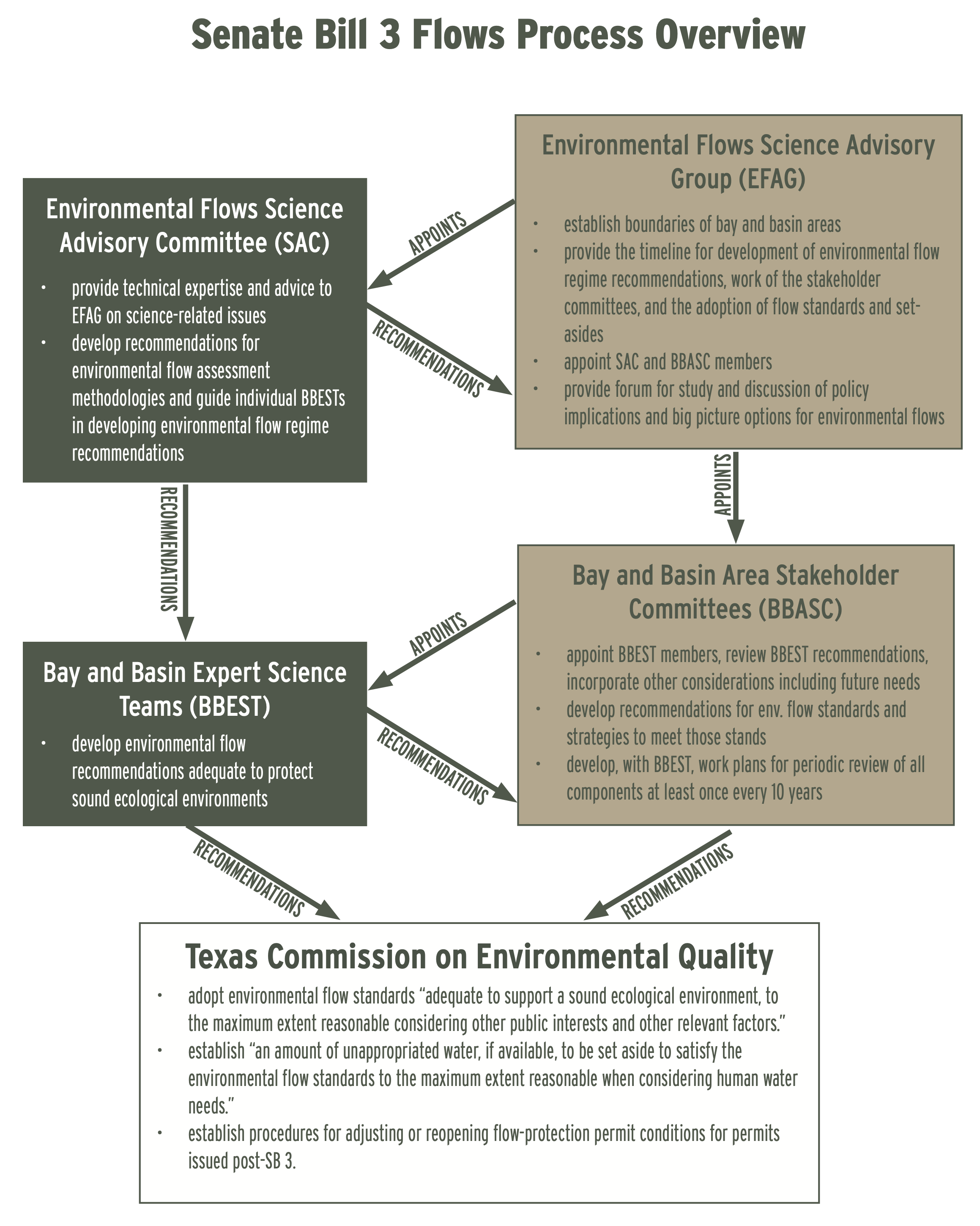 The health of Texas’ treasured streams, rivers, and estuaries is at serious risk due to the depletion of the amount of water flowing through rivers to the coast. Recognizing that risk, the Texas Legislature, in 2007, enacted potentially far-reaching legislation (Senate Bill 3) providing for protection of environmental flows in Texas.