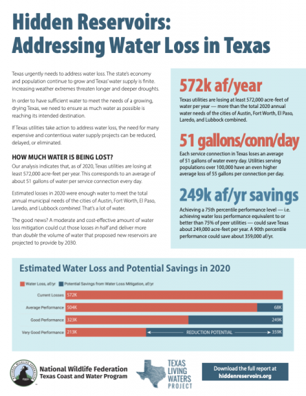 “The numbers suggest water loss in Texas is as much an opportunity as it is a problem,” said Jennifer Walker, lead author of the report and director of the National Wildlife Federation’s Texas Coast and Water program. “Texas is both growing and drying, so it’s increasingly critical to ensure as much water as possible is reaching its intended destination. We thank Senator Perry, Representative King and the Texas House for their prioritization of this critical issue.”