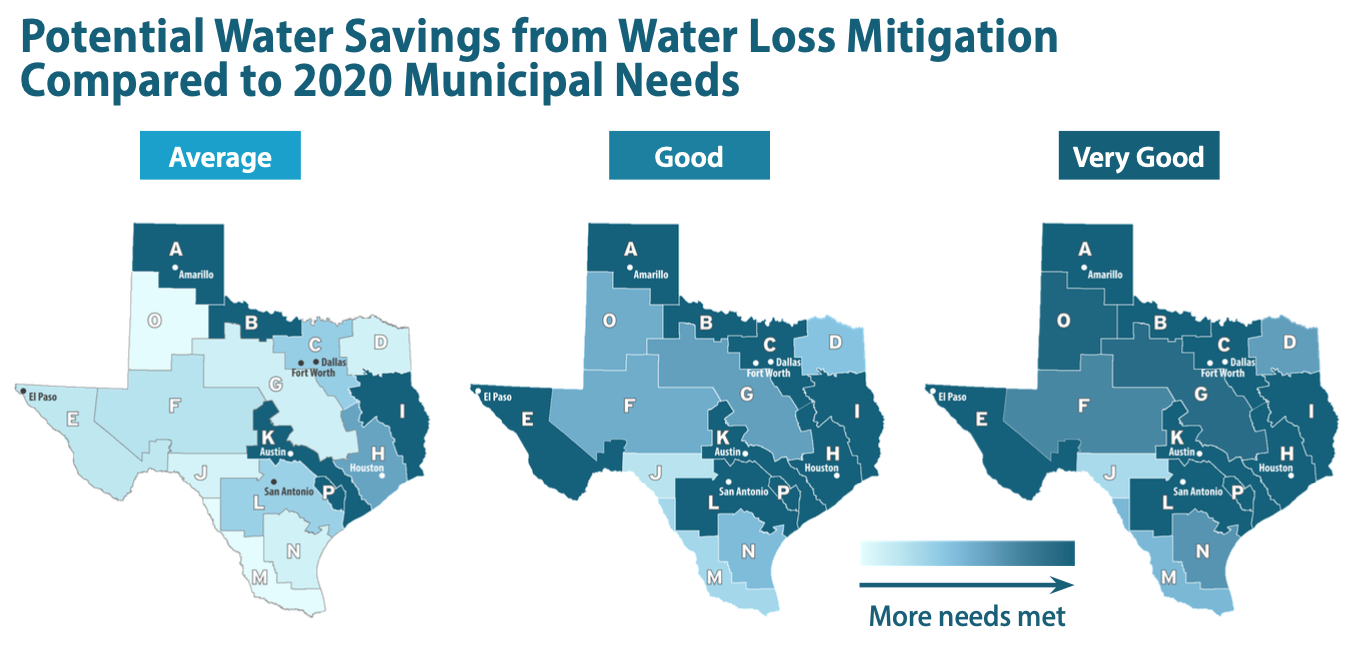 Our work has shown Texas water systems are losing at least 572,000 acre-feet of water per year — more than the 2020 annual water demand of Austin, Fort Worth, El Paso, Laredo, and Lubbock combined. Fixing leaks and replacing aging infrastructure could cut those losses in half and deliver more than four times the volume of water that new reservoirs have provided since 2010.